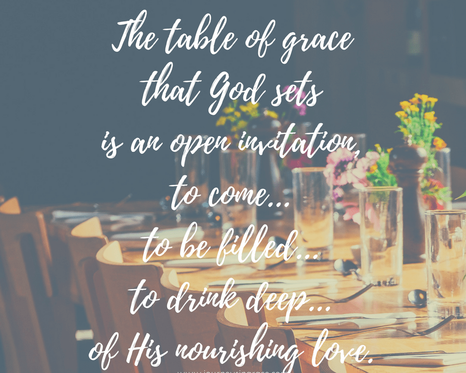 Friends, that is what God is calling us to….He’s prepared a place for us at His Table! He’s inviting us to come, brining our sorrows, our joys, our prayers and our praises to Him. He longs to enjoy company with us!